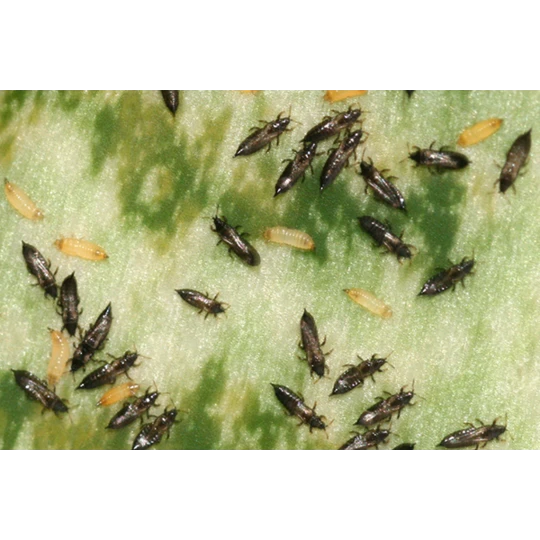 De trips kan vliegen, waardoor hij zich razendsnel kan verplaatsen en ook de plaag zich snel verspreid. De trips is een klein dun insect, met een breedte van bijna 1 mm. De vleugels zijn bijna transparant. Deze kleine insecten (minder dan 1 mm breed) voeden zich door in de cel van het blad te prikken om vervolgens de inhoud op te zuigen. Je zult dit zien doordat bladeren zilverachtige vlekken tonen met daarop kleine donkergroene vlekjes. Wanneer bladeren extreem zijn aangetast, zullen ze bladeren zelfs verdrogen. De volwassen trips verpopt zich in de bodem onder de plant en zal zich daarna weer verplaatsen naar de plant. Vervolgens legt de trips zijn eitjes weer in de plant, waardoor er nieuwe larven ontstaan. De larven van de trips zijn uitstekend te bestrijden met aaltjes.